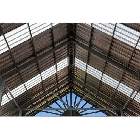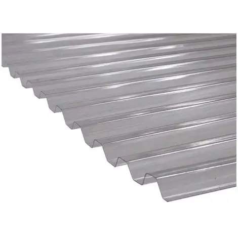 Panneau nervurĂ© (onde greca) pour toiture en PVC transparent lĂ©gèrement bleutĂ©. Solution très Ă©conomique (beaucoup moins cher que le verre), transmission lumineuse plus faible que d’autres matĂ©riaux comme le verre synthĂ©tique. Nettoyage facile et rapide du toit d’un abri de piscine par exemple.